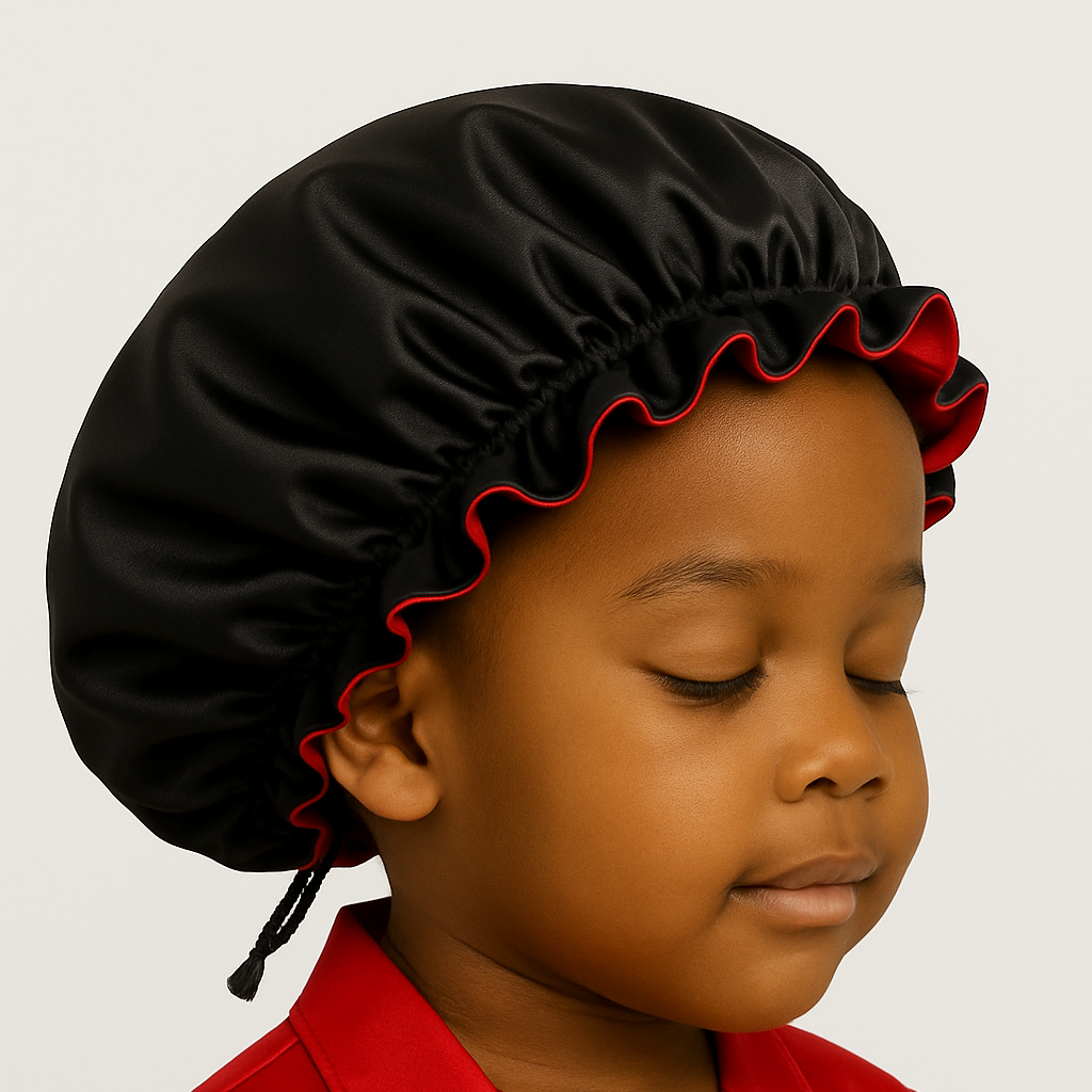 Our Kiddie Reversible Ruffle Bonnet is designed for mini queens with big personalities. It features two satin sides, so your little one can flip it depending on the day—and a comfy drawstring that keeps the bonnet snug without slipping. Whether they’re deep in dreamland or twirling through playtime, this bonnet keeps styles neat and hair happy. Hair care has never been this cute (or easy).