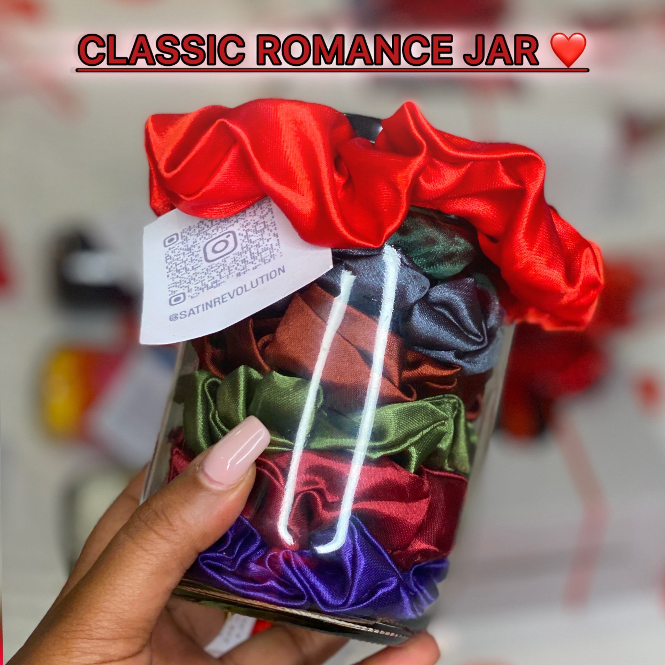 The Classic Romance jar is filled with 7 fluffy satin scrunchies in rich, dramatic hues: red, emerald green, dark grey, rust brown, jungle green, maroon, and purple.